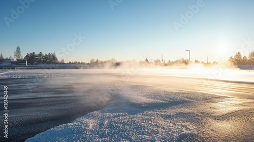 winter, landscape, snow, ice, glacé, cold, sunrise, sun, light, sky, clear, blue, tree, horizon, frost, ground, surface, texture, outdoors, scene, nature, season, morning, calm, peaceful, quiet, serene, tranquil, huge, open