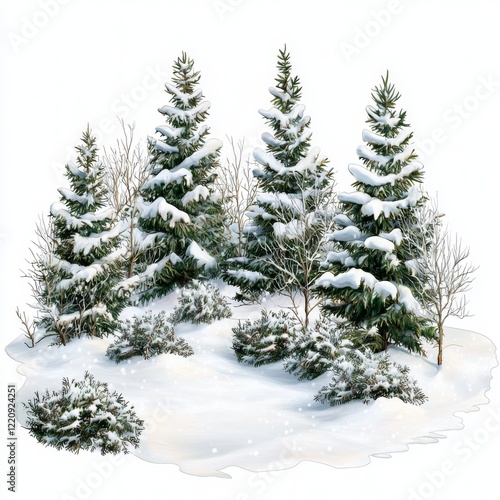 Snowy Forest Scene with Evergreen Trees and Frosty Ground, Ideal for Winter Themed Designs and Holiday Projects