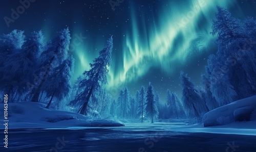 forest, winter, night, sky, tree, snow, aurora, borealis, glacé, starry, magical, nature, landscape, cold, dark, light, blue, ice, river, frost, green, beautiful, mystic, peaceful, calmness, wonder, serene, awe, sublime