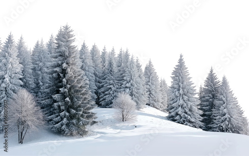 Snowy forest, winter landscape, pine trees covered in snow, isolated on a white background, detailed, PNG photo stock.