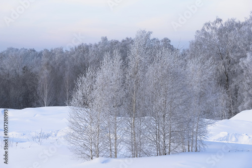 Snowy frosty forest. Beautiful view of snowy trees. Cold winter day
