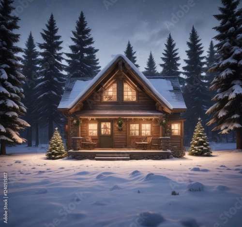 christmas tree, winter landscape, cabin