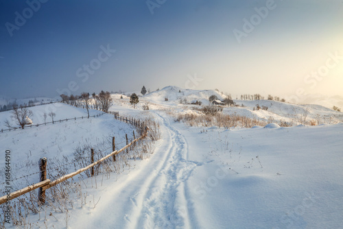 snow, landscape, pathway, fence, winter, hill, snow-covered, tree, nature, cold, season, scenic, rural, frost, white, serene, horizon, clear, morning, calmness, quiet, weather, crisp, untouched, wilderness, travel, exploration, countryside, peaceful, solitude, day, earth, space