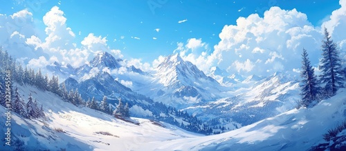 Snowy mountain landscape featuring majestic peaks under a bright blue sky with fluffy white clouds and foreground of pristine snow drifts and pine trees