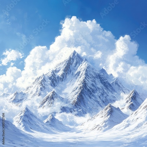 Snowy mountain peak towering above a pristine winter landscape, with a bright blue sky and fluffy clouds.-