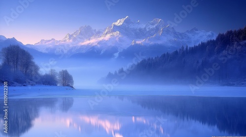 snow, mountain, range, lake, glacé, water, blue, sky, tree, forest, winter, cold, calm, peaceful, serene, tranquil, nature, landscape, scenic, beautiful, majestic, picturesque, breathtaking, stunning, horizon, huge, wilderness, distant, panoramic, morning, dawn, sunrise, light, soft, white, ice, frost, fog, mist, airy, aethereal, calmness, silence, serenity, stillness