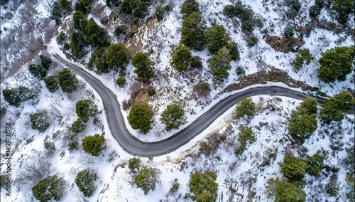 winter, road, snow, aerial, mountain, landscape, tree, forest, curve, winding, path, scenic, nature, snow-covered, view, high, angle, route, glacé, icy, pathway, drive, scenery, mountainous, pine, evergreen, grey, white, green, travel, tour tourism, photo, covered