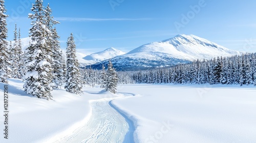 Snowy mountain trail, winter landscape, cross-country skiing