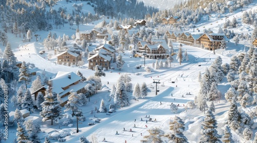 mountain, snow, winter, skiing, resort, village, cabin, tree, forest, pine, snowy, slope, hill, alpine, nature, sky, landscape, aerial, view, holiday, vacation, travel, cold, glacé, white, blue, green, yellow, brown, grey, sun, light, bright, calm, serene, peaceful, beautiful, idylli, cosy, charming, rustic, scenery, outdoors