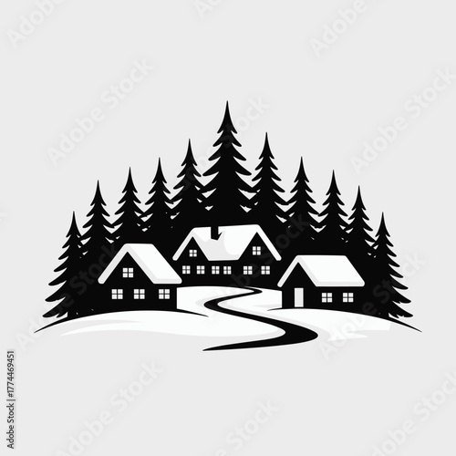 Snowy Mountain Village Winter Silhouette Vector Minimal Black Design White Background