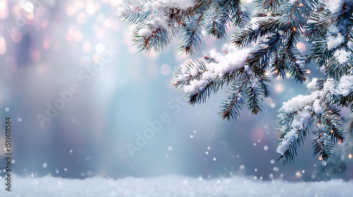 Snowy pine boughs frame a soft bokehlit winter scene with a snowcovered foreground
