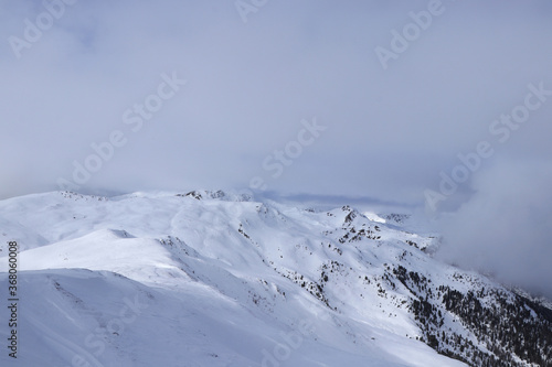 Snowy plains in the west of Austria in Tyrol, not far from the Italian border. View from the highest cable car station in Sillian ski resort on Hochrast peak, Gumriaul mountain