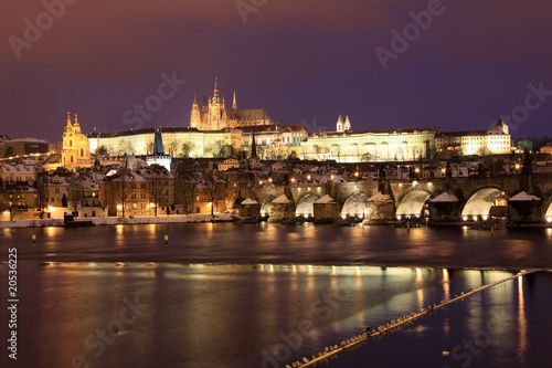 Snowy Prague gothic Castle with Charles Bridge in the Night