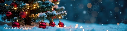 Snowy tree with sparkling lights and colorful ornaments scattered around the base, evergreen tree, sparkle