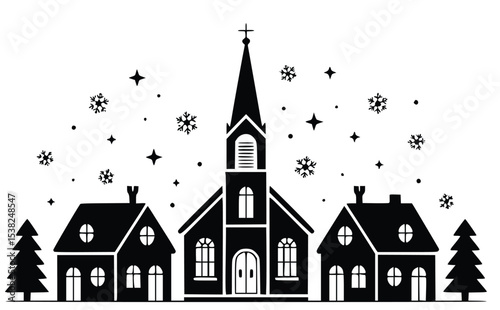 Snowy Village Scene with Church and Houses Winter Holiday Design Illustration, silhouette