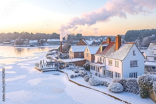 winter, snow, village, house, river, glacé, sunrise, sunset, frost, cold, landscape, scenic, idylli, peaceful, tranquil, christmas, holiday, bungalow, home, architecture, building, waterway, ice, morning, dawn, nature, beautiful, picturesque, serene, calm, winter landscape, rural, countryside, britain, british, england, corporate, artistic, fitness, conceptual