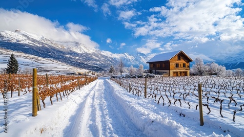 Snowy Vineyard Pathway with Country House in Winter
