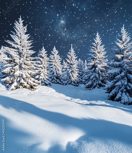 winter, snow, tree, forest, night, star, sky, snowy, snow-covered, winter landscape, christmas, holiday, cold, serene, peaceful, magical, beautiful, nature, landscape, scenic, frost, pine tree, evergreen, conifer, mountain, wood, dark, blue, white, icy, glacé, stillness, tranquil, calm, winter landscape, snowdrift, shadow, night sky