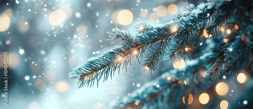 snowy winter scene featuring close up of pine branch adorned with soft glowing lights, creating magical and festive atmosphere
