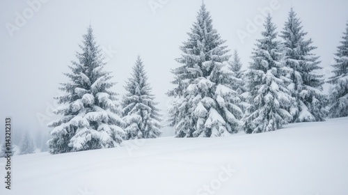 Snowy Winter Wonderland: Majestic Snow-Covered Fir Trees in a Serene Mountain Landscape