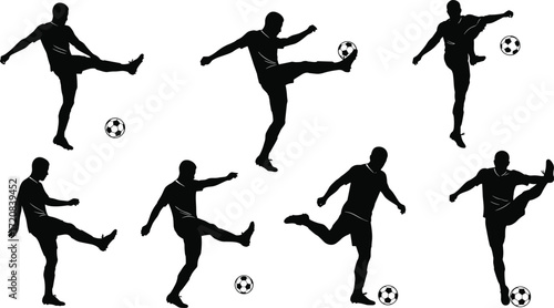 Soccer player silhouettes, football athlete kicking ball, vector sportsman artwork, competitive match action, team training illustration, running player design, fitness pose graphic