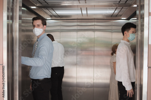 Social Distancing on Elevator with passenger stand in the corner from outbreak of coronavirus covid19 situation. Concept of aware safe and low risk.