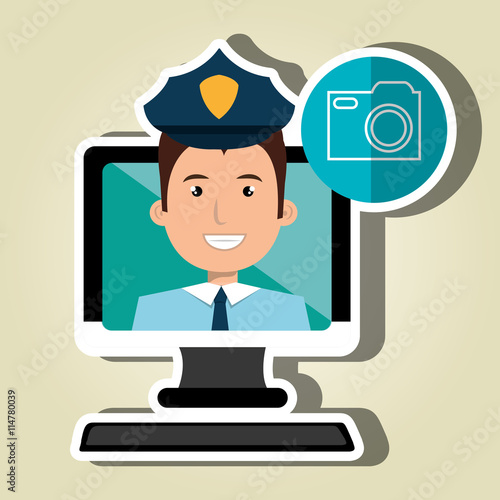 computer, user, police, agent, man, male, camera, photographic, photo, men at work, uniform, hat, law, security, icon, desktop, media, social, business, communication, design, online, background, technology, vector, web, network, illustration, connection, monitor, concept, flat, symbol, information, global, mobile, marketing, isometric, person, human, signs, element, figure