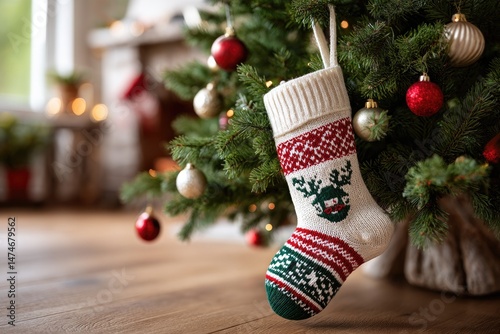 Sock hanging under a traditional Christmas tree, red and green ornaments, cozy living room setting