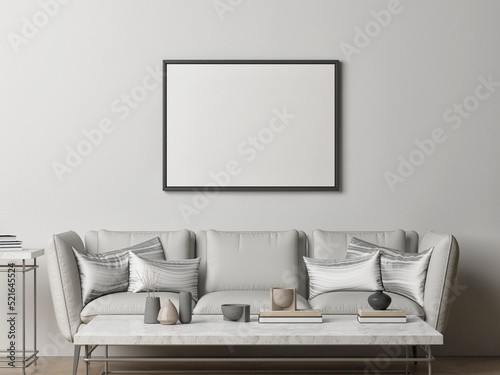 Sofa with pillows, mock up poster in living room design, 3d illustration.