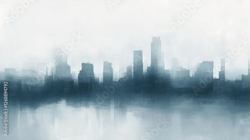 Soft abstract silhouette of a city skyline blending into fog with reflection in serene waters at dawn