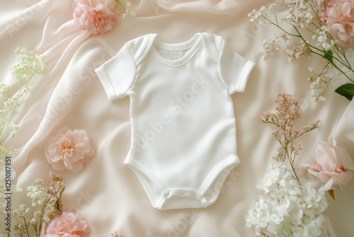 Soft baby onesie delicately folded among blooming flowers on a light fabric backdrop. Generative AI