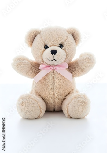 Soft beige teddy bear with pink satin bow sitting on white surface against white background