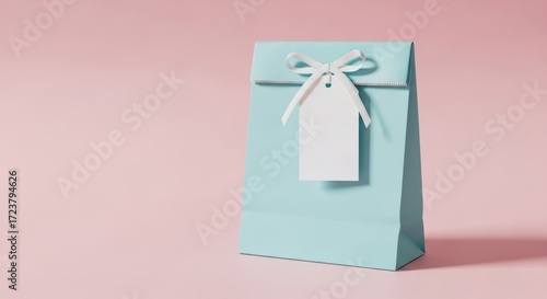 Soft blue gift bag with a blank tag and ribbon on a pastel pink background