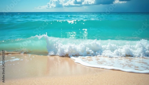 Soft blue ocean wave gently lapping at the sandy shoreline, shoreline, blue wave
