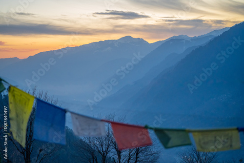 Soft blue sunrise himalaya mountain ridges fading into mist, calm natural landscape with colorful prayer flags in foreground in Manali, kullu, Kashmir India