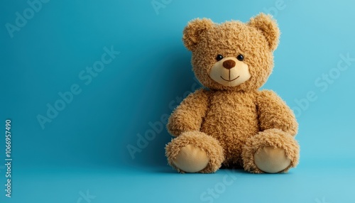 Soft brown teddy bear sitting on a vibrant blue background indoors