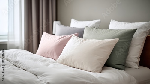 Soft, cozy bedding arrangement featuring various decorative pillows in pastel colors on a neatly made bed, with natural light streaming through a window, creating a serene and inviting atmosphere