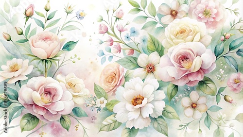 Soft, dreamy watercolor and pastel hues blend in a whimsical abstract design, featuring delicate florals, subtle