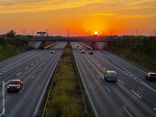sunset, highway, denmark, traffic, car, road, evening light, golden hour, transportation, travel, landscape, sky, cloud, perspective, motion, urban scene, infrastructure, europa, warm colors, outdoors, driving, bridge, horizon, scenic view, summer evening, expressway, commute