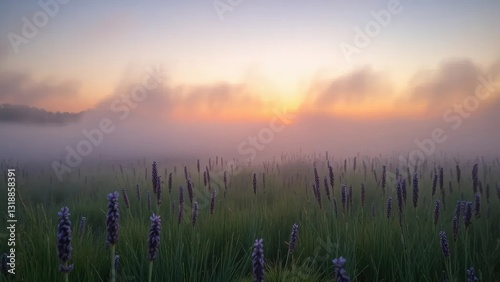 Soft lavender mist drifts above a peaceful meadow at dusk, blending with the fading light, serene, mist
