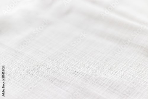 Soft light gray natural linen texture with focus at the bottom. Crumpled fabric background. Selective focus. Closeup view