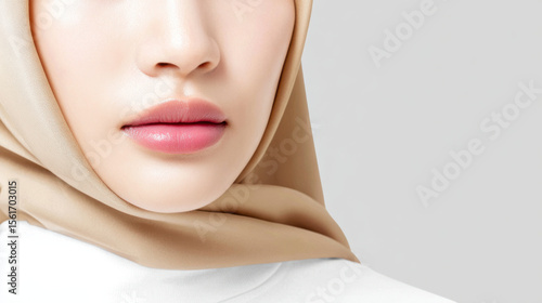 Soft lips with natural pink tone and smooth skin wearing beige hijab create delicate beauty look enhanced by subtle cosmetics for fresh appearance