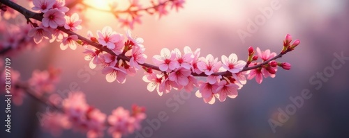 Soft morning light casts a glow on blossoming cherry branches, blossoms, landscape, scenery