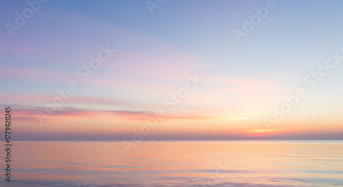 Soft, Pastel Gradient Sunset or Sunrise Over Calm Ocean Horizon A beautifully serene and minimalist landscape photo capturing the gentle transition of colors during either sunset or sunrise over