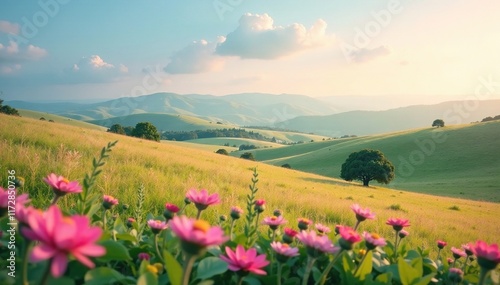 Soft pastel hues on rolling hills with blooming wildflowers, countryside, soft focus, rolling hills