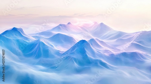 Soft pastel mountains rise against a tranquil sky, bathed in gentle sunset light. The landscape features flowing shapes and hues of blue, evoking a peaceful ambiance