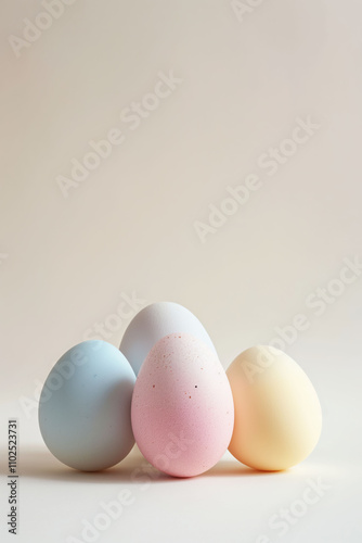 Soft pastel-colored Easter eggs arranged on a white background in minimalistic style