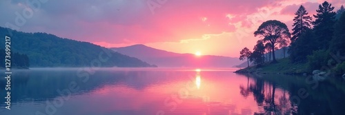 Soft pink and blue hues at sunset over a calm lake with trees, trees, pastel colors, sunset