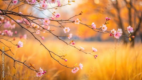 Soft pink petals unfurl from bare branches in a vast, serene landscape of golden grasses and fading autumn leaves, empty field, blooming flowers