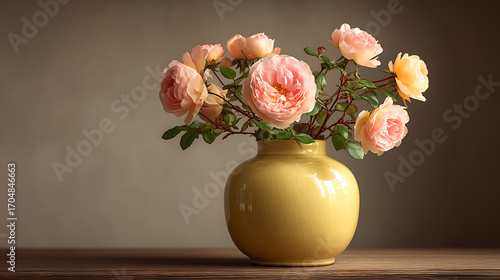 Soft pink roses in a vintage yellow vase on a rustic wooden table